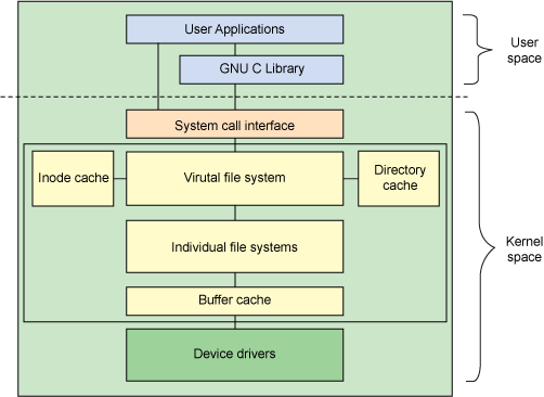 VFS 是底层文件系统的主要接口。这个组件导出一组接口,然后将它们抽象到各个文件系统,各个文件系统的行为可能差异很大。 有两个针对文件系统对象的缓存(inode 和 dentry)。它们缓存最近使用过的文件系统对象。